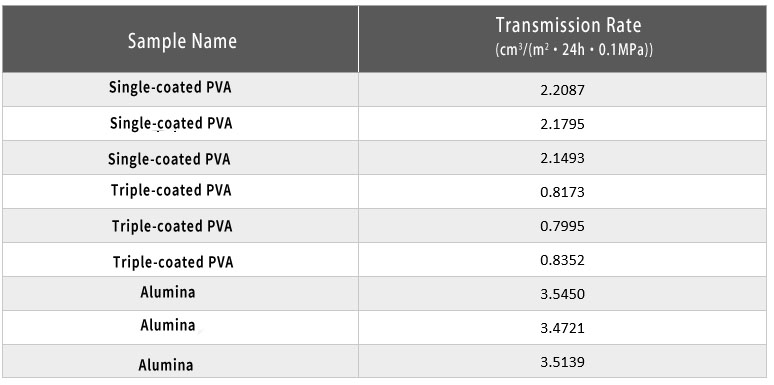 This would typically be a table or chart showing the specific Gas Transmission Rate (GTR) results for each sample type, likely indicating very low GTR for the ceramic membrane and varying GTR for the PVA membranes, with the triple-coated PVA expected to have a lower GTR than the single-coated one.