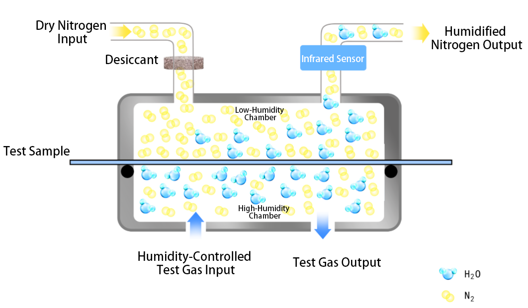 de muestras en condiciones controladas de temperatura y humedad. Ideal para analizar la permeabilidad al vapor de agua de películas, láminas, papeles, envases y diversos materiales en industrias como la alimentaria, farmacéutica, de dispositivos médicos, química de uso diario y electrónica fotovoltaica, es un instrumento esencial, tanto en línea como fuera de línea, para que los fabricantes de envases evalúen el rendimiento de barrera de sus materiales.